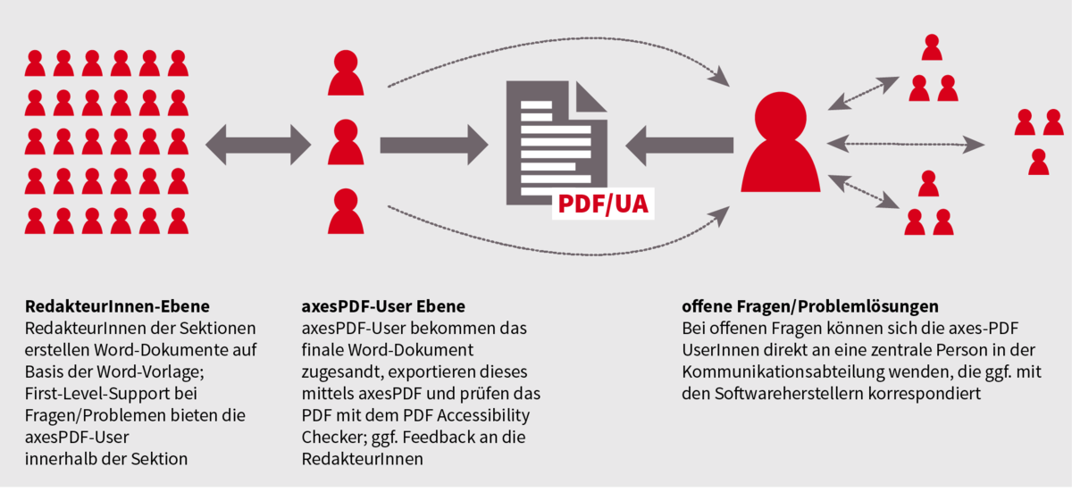 Die Redakteurin bzw. der Redakteur sendet das finale Dokument an den axesPDF User innerhalb seiner Sektion. Dort wird das PDF mit dem PlugIn exportiert und im Anschluss einer Qualitätssicherung unterzogen. Im ersten Schritt wird maschinell (mittels PDF Accessibility Checker der Stiftung „Zugang für Alle“) geprüft. Werden keine Fehler gefunden, wird in einem weiteren Schritt über die Screenreader Preview eine Sichtkontrolle durchgeführt. Somit lässt sich die Qualität auf zwei Ebenen sicherstellen. Detailkenntnisse wie Tagbaumkontrolle, Rollenzuordnung usw. werden in der Regel nicht benötigt, da diese Eigenschaften von axesPDF korrekt umgesetzt werden. Bei Problemen übernimmt diese Aufgabe der Second-Level-Support.